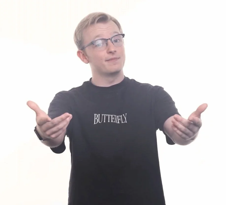 A young man with glasses, wearing a black t-shirt with the word 'BUTTERFLY' on it, holds out his hands with palms up, making a questioning or inviting gesture.