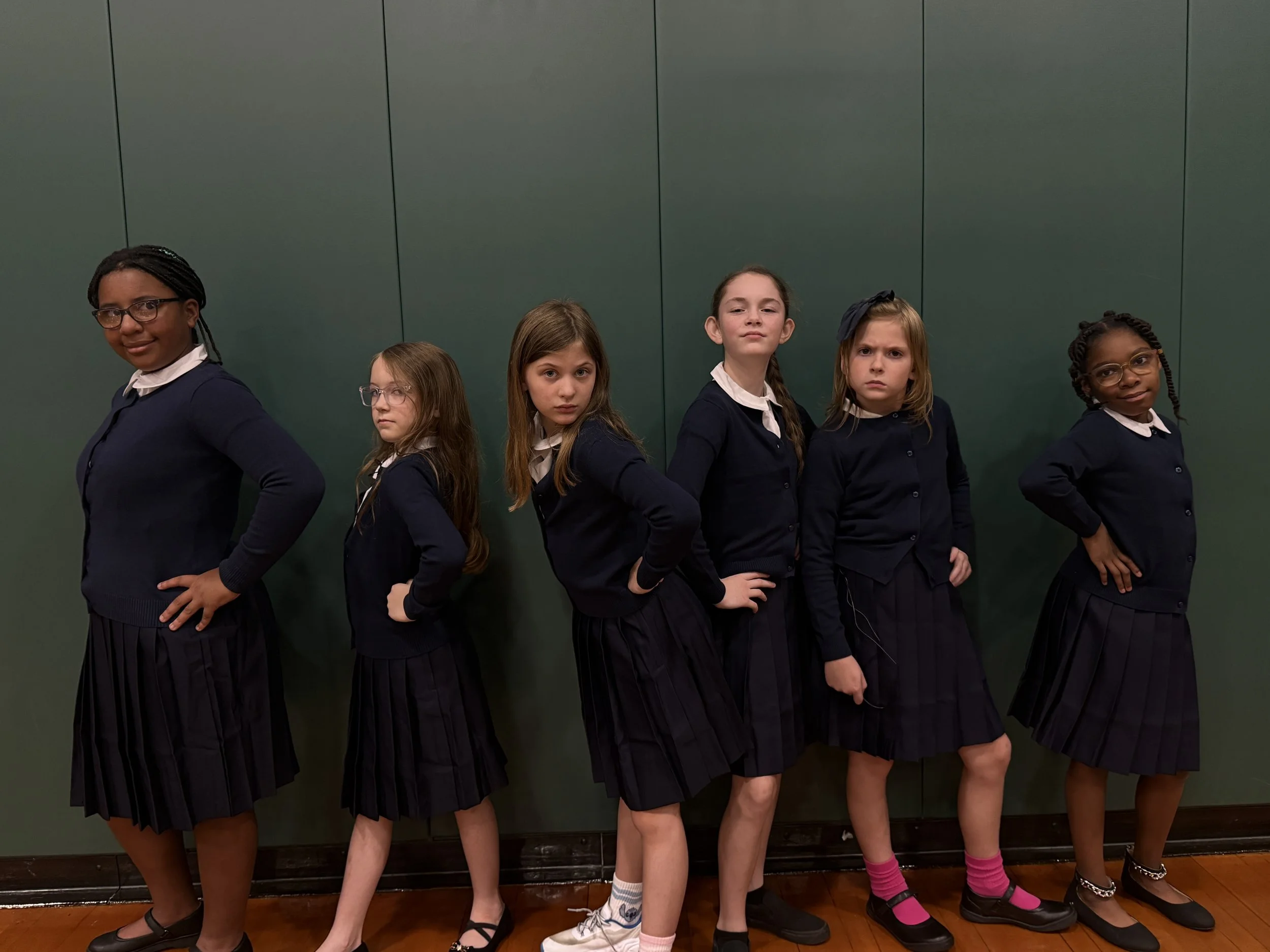 Six young girls in school uniforms posing with hands on hips against a green wall.